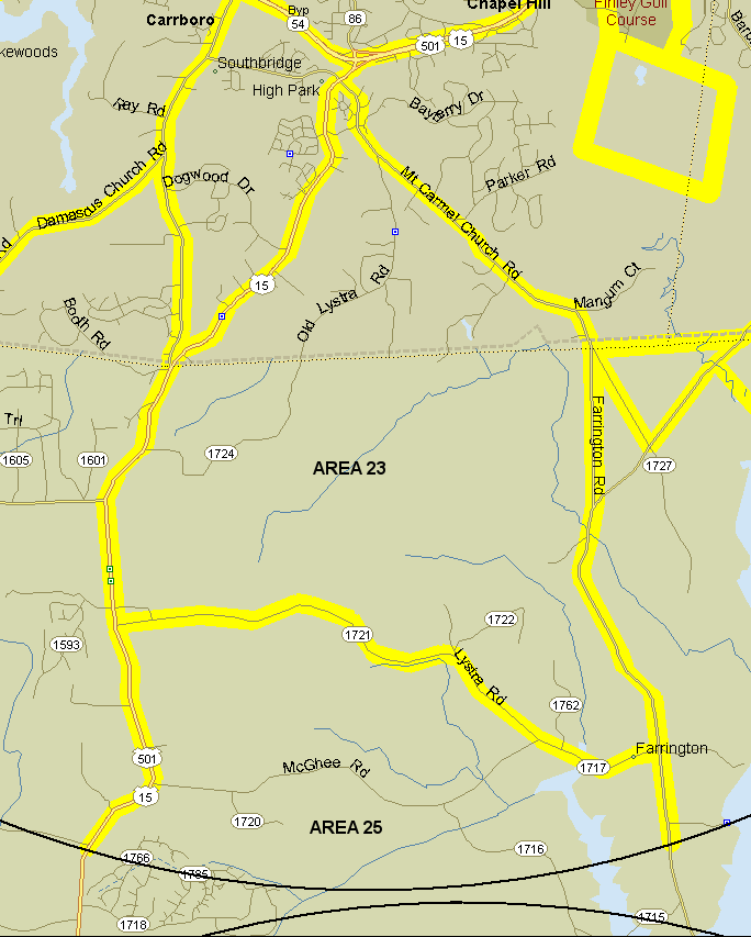 23. Edwards Mountain area. Bounded by US 15-501 on west, Mt. Carmel Ch. Rd./SR 1008 on north and east, and Lystra Ch. Rd. on south. Includes Governor's Club. Do not count Farrington Road (1008) itself, just areas to the west. Notes: This area includes extensive swampy forested game lands to the west of Farrington Road, but access is difficult.