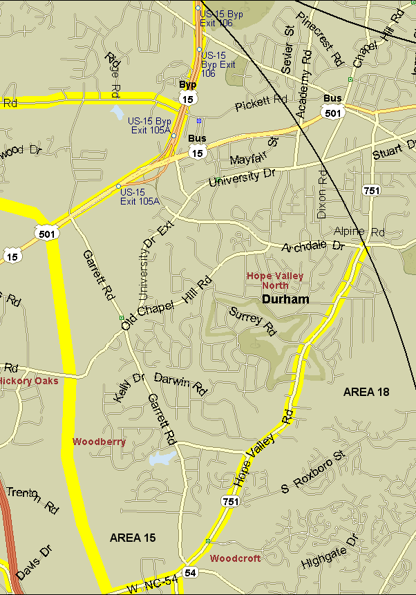 15. Hope Valley area. Bounded by count circle and NC 751 (Hope Valley Rd.) on east, NC 54 on south, east side of New Hope Creek on west, and 15-501 on northwest. Notes: This area does not include New Hope Creek itself, but does include the eastern half of the New Hope Creek impoundment. See NC 54 impoundments for some ideas on where to go.
