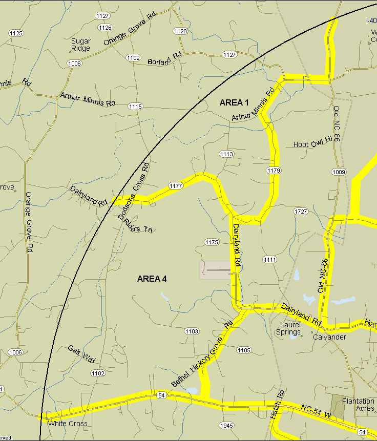 4. Dodson's Crossroads area. Bounded on north by Dairyland Rd., on east by Dairyland and Bethel-Hickory Grove Ch. Rd., on south by NC 54, on west by count circle. Count the north side of NC 54 and both sides of Bethel-Hickory Grove Ch. Rd., but do not count Dairyland Road. Notes: Includes the American Stone quarry and pond. The pond rarely has anything on it, but had a Horned Grebe in 2008. The quarry is a suspected nesting area for Common Raven, but so far no birder has sought permission to check.