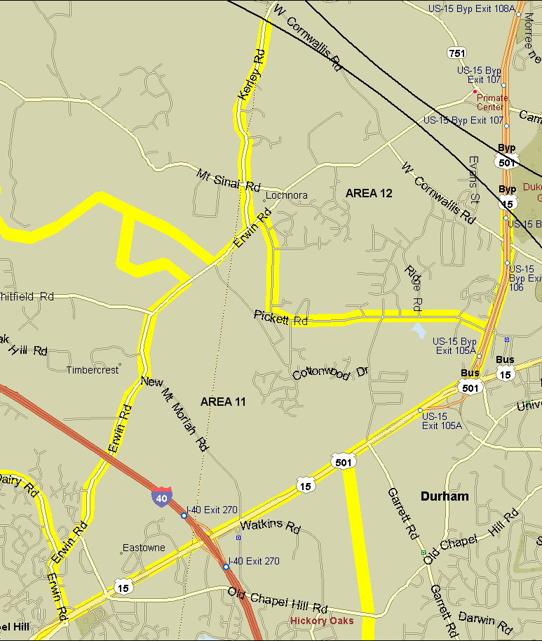 12. Mud Creek area. Bounded on the east by 15-501 from the count circle to Pickett Rd. Bounded on the west by New Hope and Mud Creeks to Pickett Rd., following (but not including) Pickett and Randolph to Erwin. North of Erwin, bounded on the west by Kerley to the count circle. Includes Mud Creek swamp on Erwin Rd. at edge of count circle. Notes: