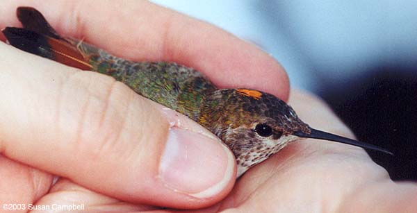 | The adult female Rufous Hummingbird being released after being banded and color-marked (note the orange blotch on top of the head) by Susan Campbell. Her notes on this bird: "The Kilgour's hummingbird is an adult female Rufous. She was banded on 12/23/03. Her size (wing of 45.05 mm) and second rectrix shape (nippled) confirmed her identity. She was in very healthy condition with a bit of molt on the head and wing (primaries 1-5 brand new). She has 12 iridescent feathers in her gorget that are tipped red-orange. In addition to the characteristic rufous at the base of her tail feathers, she has substantial rufous feathering along her flanks, on the sides of her face and in her undertail coverts." |